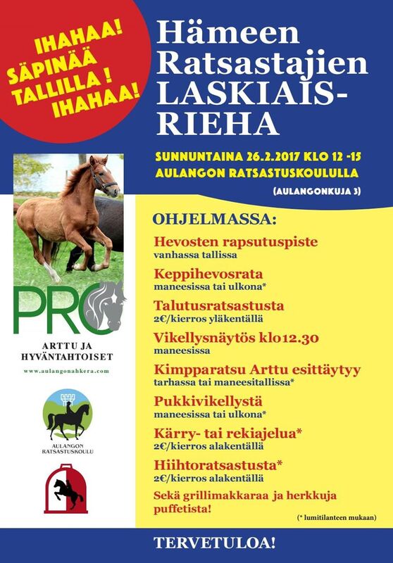 Laskiaisrieha Aulangolla 26.2 klo. 12-15. Ohjelmassa mm. makkaranpaistoa, talutusratsastus,ta hiihtoratsastusta ja rekiajoa. Pakkasraja -20 C. Tervetuloa. Liitteet