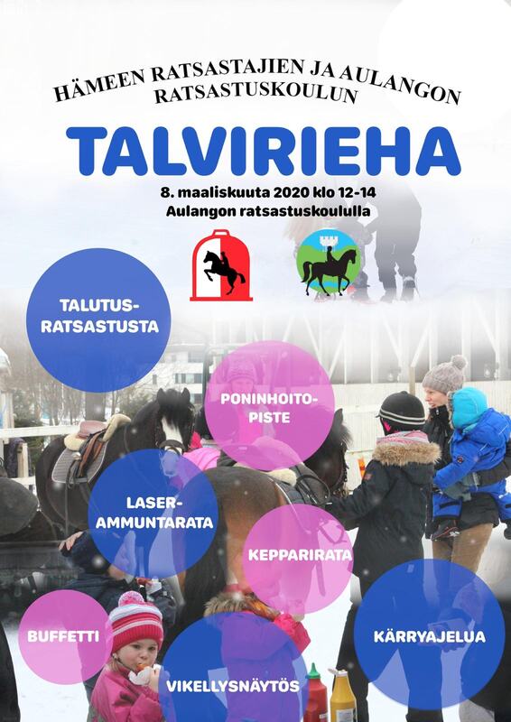 Perinteinen talvirieha järjestetään jälleen Aulangolla 8.3. klo 12-14 Paikalla monenlaista hauskaa mm: talutusratsastusta, vikellysnäytös, poninhoitopiste sekä nykyaikaisen 5-ottelun esittelyä. Lisää infoa instagramissa ja Hämeen ratsastajien facebookissa.